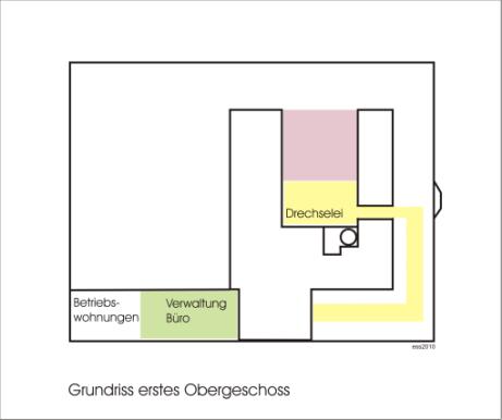 Im Erdgeschoss des Gebäudes befand sich ein Sägegatter zum Schneiden von Vierkant-Stangen, die dann mit einem Aufzug in das zweite Obergeschoss, den Trockenboden transportiert wurden. Hier waren die Fensteröffnungen nicht verglast sondern mit Lüftungslamellen versehen.